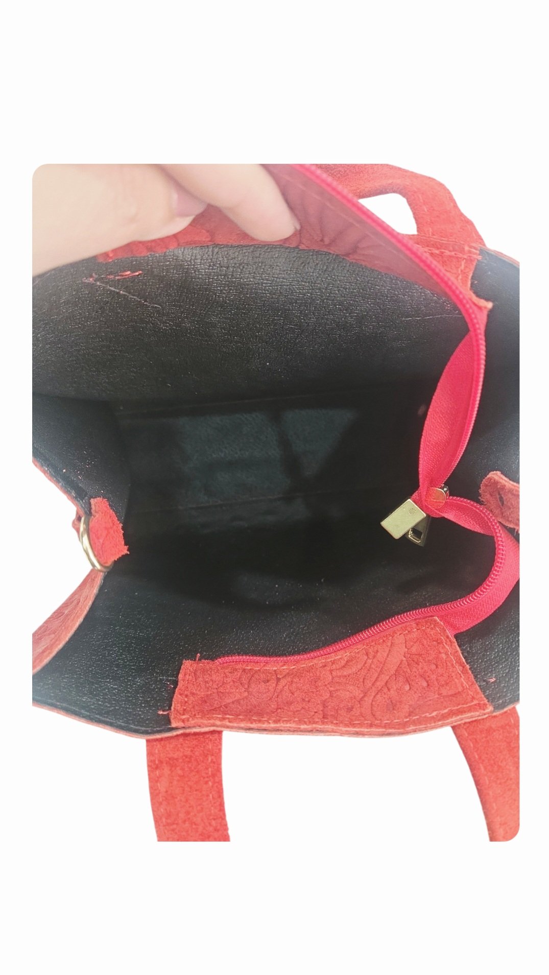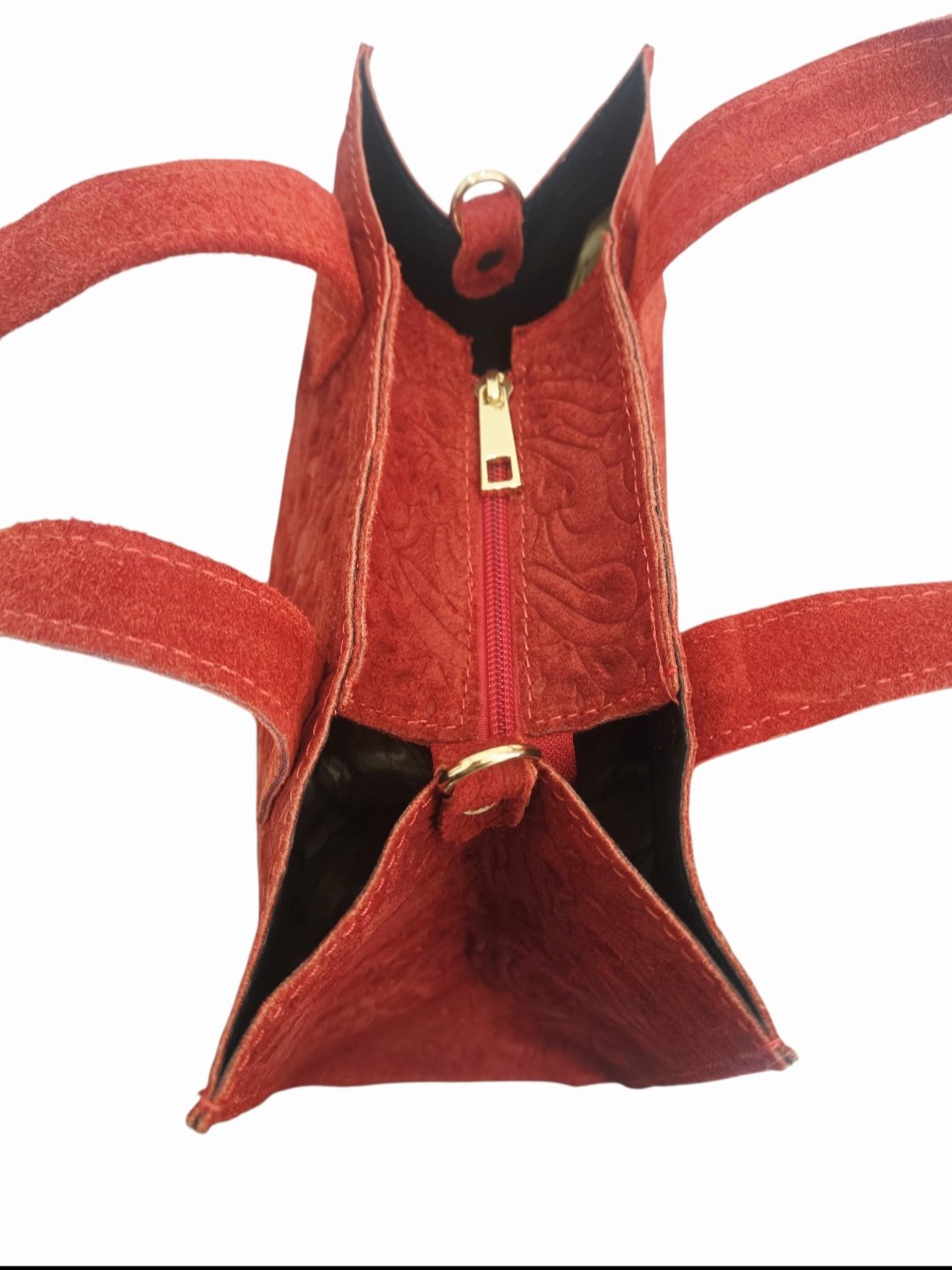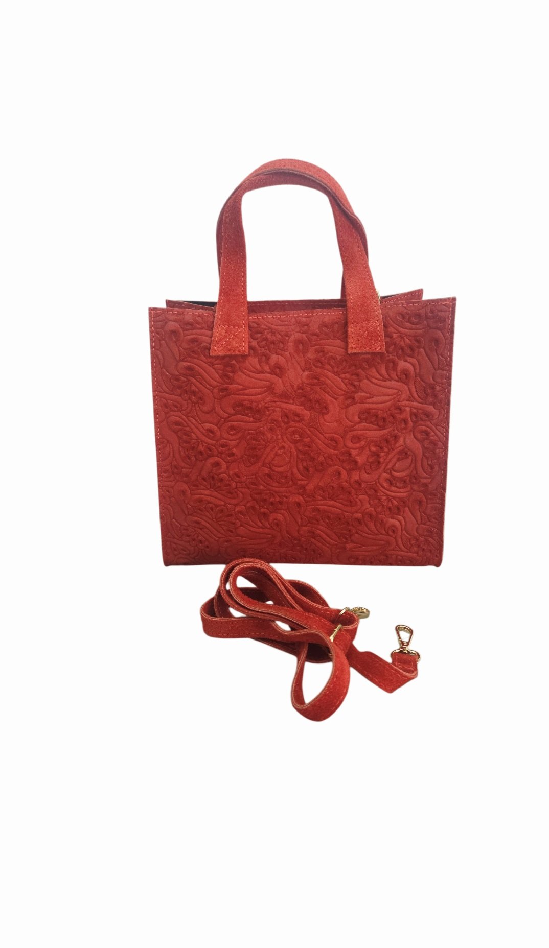 Lasciati conquistare dalla raffinata eleganza della nostra borsa in vera pelle, arricchita da un sofisticato camoscio stampato. Questo accessorio, orgogliosamente made in Italy, unisce qualità e stile in un design iconico e funzionale. La borsa è dotata di una pratica tracolla regolabile, che la rende versatile per ogni tua esigenza. La chiusura con zip garantisce sicurezza e praticità, mentre l’ampia tasca interna ti permette di organizzare al meglio i tuoi effetti personali. Con dimensioni compatte ma spaziose (H26 B12 L27 cm), è l’ideale sia per un uso quotidiano che per un’occasione speciale. Disponibile in un vivace colore rosso, questo accessorio diventerà il tuo alleato di stile preferito, donando un tocco di classe e originalità al tuo outfit.