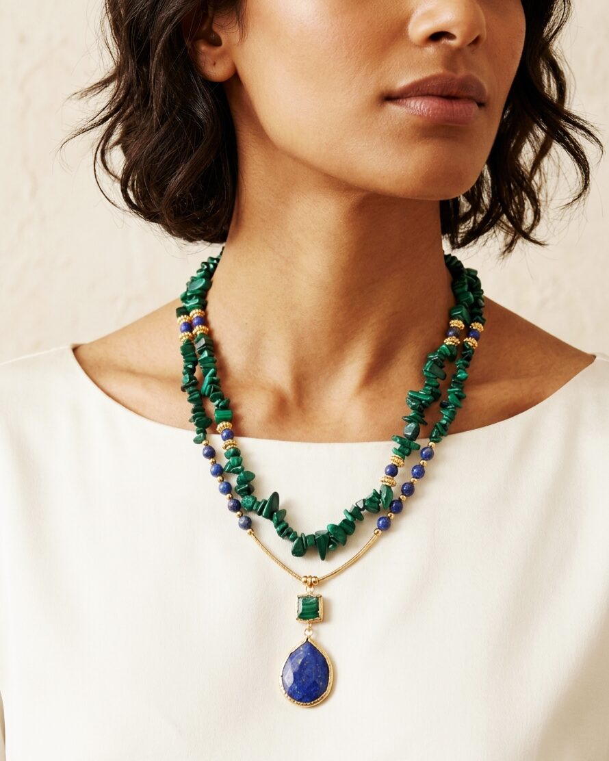 La nostra collana girocollo regolabile a doppio filo è un’aggiunta sofisticata al tuo guardaroba. Realizzata con cura artigianale, combina la bellezza naturale della malachite e del lapislazzuli con l’eleganza degli elementi dorati in ottone. Con una lunghezza complessiva di 48 cm e un ciondolo accattivante di 5 cm, questa collana si adatta perfettamente al tuo stile. La malachite, con la sua ricca tonalità verde, e i lapislazzuli, con il loro blu profondo, creano un contrasto affascinante che cattura lo sguardo. Gli elementi dorati in ottone aggiungono un tocco di lusso, rendendo questa collana ideale per ogni occasione, dalla serata elegante al look quotidiano. Il design regolabile assicura una vestibilità comoda, permettendoti di personalizzare la lunghezza secondo le tue preferenze. Indossa questa collana per esprimere il tuo stile unico e sofisticato.