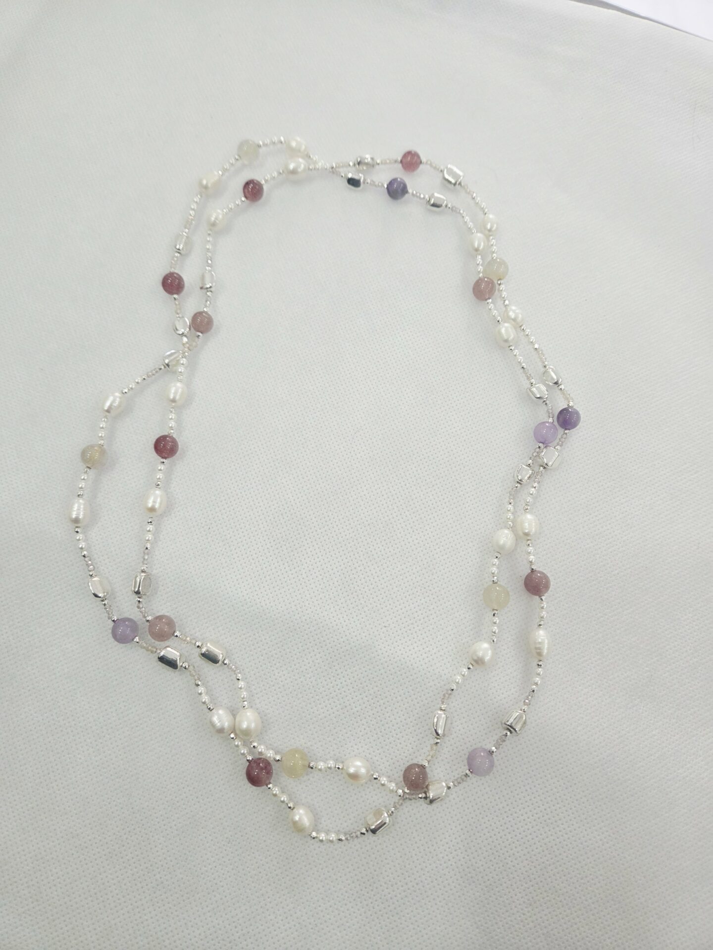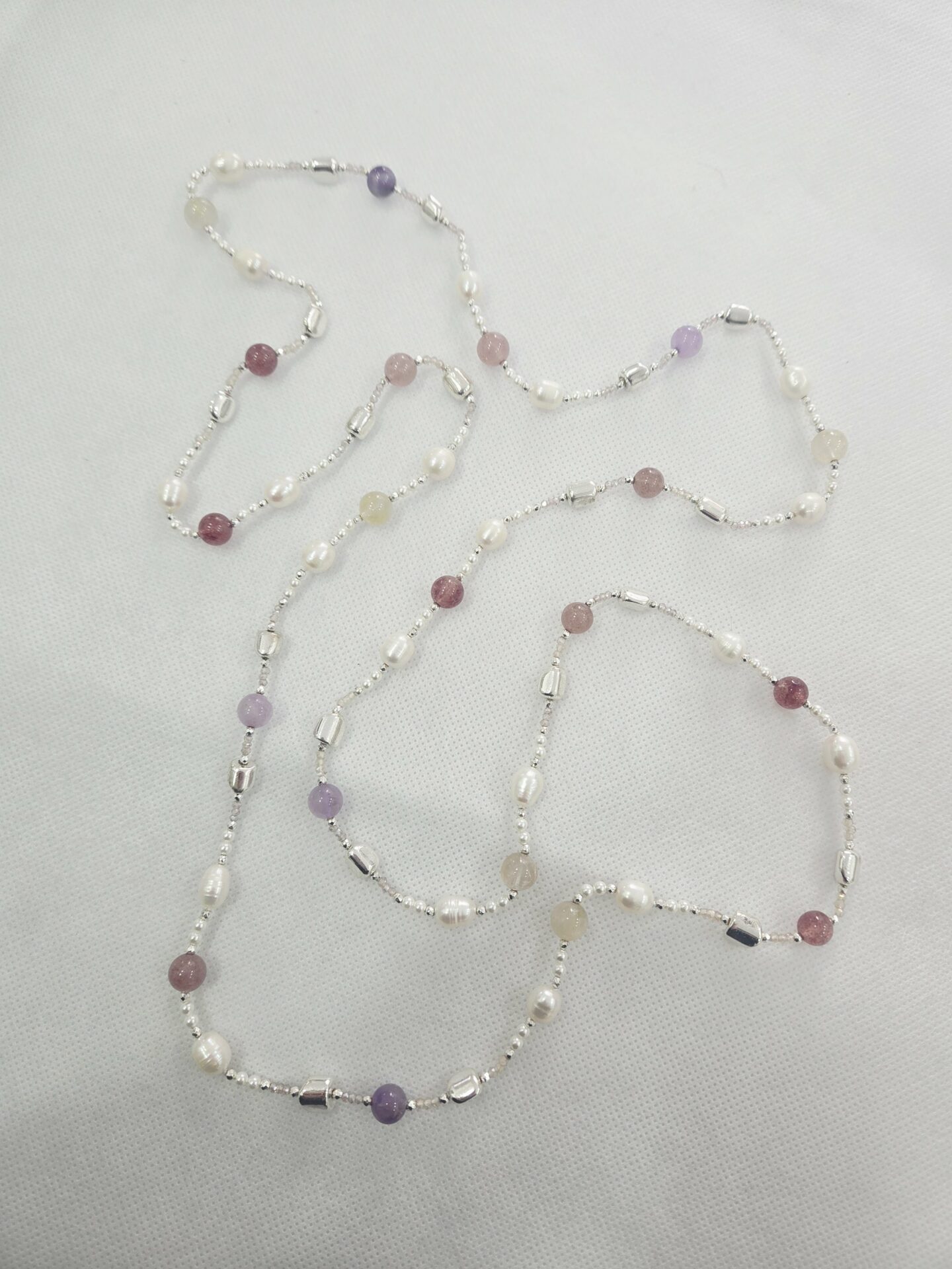 Collana lunga Charleston chanel perle di fiume,quarzi,ametista,ematite Possibilità di fare doppio giro lunghezza 128cm
