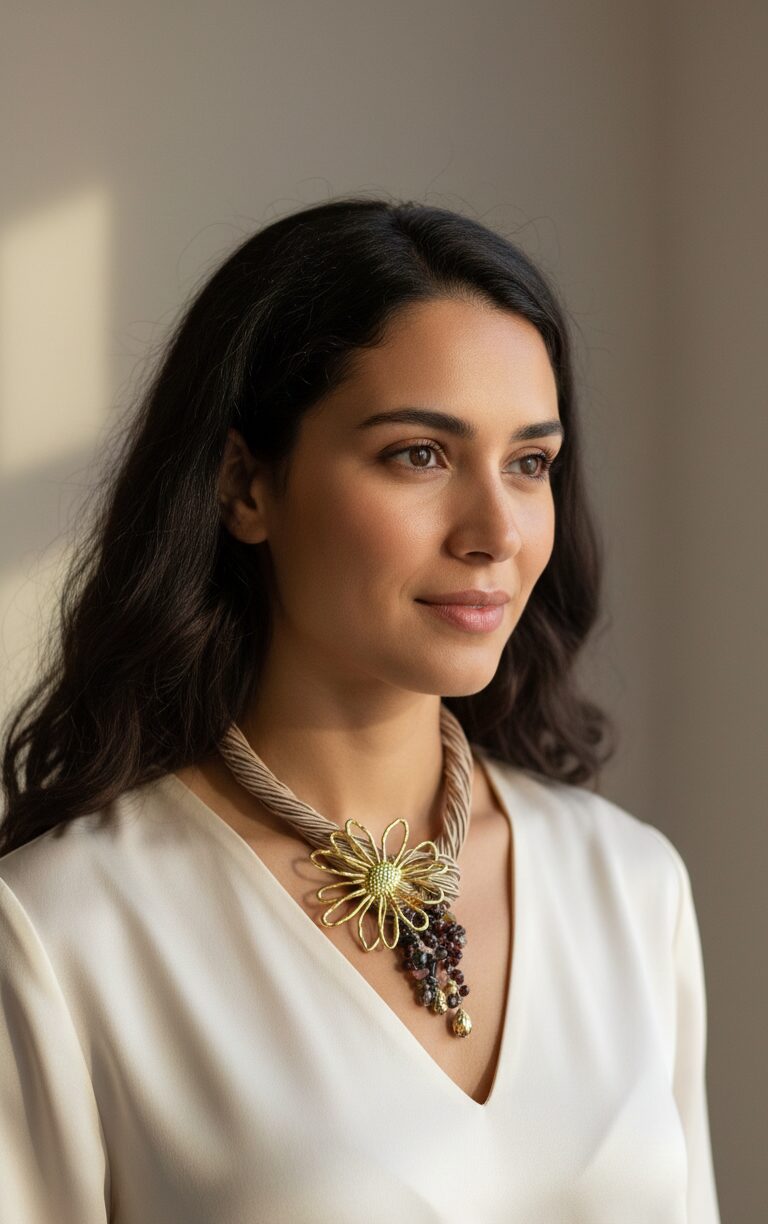 Esplora il fascino ineguagliabile della nostra collana realizzata artigianalmente. Questo gioiello esclusivo combina con maestria tessuto di alta qualità, un delicato fiore in ottone e un ciuffo di tormalina, creando un design che cattura l’attenzione. La collana è dotata di una pratica lunghezza regolabile di 45 cm, permettendoti di adattarla facilmente a qualsiasi scollatura. Ogni componente è scelto con cura per garantire non solo bellezza, ma anche durabilità nel tempo. Indossala per dare un tocco sofisticato al tuo abbigliamento quotidiano o per completare un outfit speciale. Perfetta per chi cerca un accessorio elegante e versatile, questa collana è un omaggio alla tradizione artigianale unito a un design contemporaneo. Lasciati avvolgere dalla magia delle pietre naturali e dall’eleganza dei dettagli metallici.