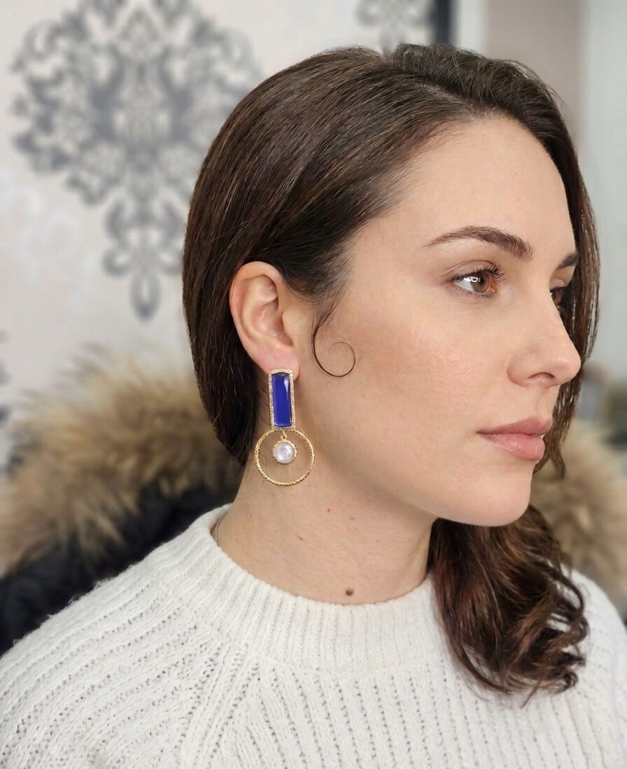 Gli orecchini con occhio di gatto blu elettrico, perla di fiume e ottone sono un gioiello unico che unisce eleganza e stile. La vivacità del blu elettrico dell’occhio di gatto cattura immediatamente l’attenzione, mentre la delicata perla di fiume aggiunge un tocco di raffinatezza. Il tutto è armoniosamente assemblato con dettagli in ottone, che conferiscono un aspetto classico e al contempo moderno. Con una lunghezza di 6 cm e un peso di soli 8,6 grammi, questi orecchini sono leggeri e confortevoli da indossare tutto il giorno. Ideali per completare sia outfit casual che serate eleganti, sono perfetti per chi desidera distinguersi con un accessorio originale e sofisticato. Esprimi la tua personalità con questi orecchini che promettono di essere il punto focale del tuo stile.