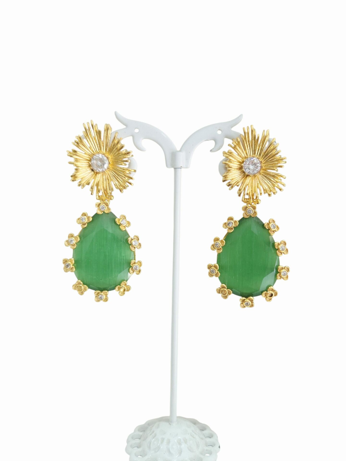 Discover the beauty of these unique earrings, crafted with cat's eye and zirconia set in brass, perfect for adding a touch of elegance to your look! Measuring 5.5 cm in length and weighing just 12.5 g, they're the perfect complement for any occasion.