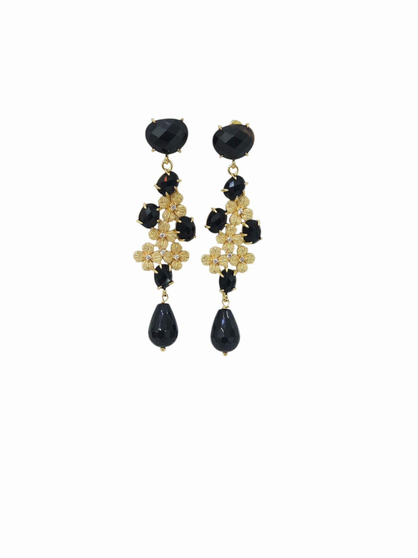 Orecchini realizzati con onice e fiorellini in ottone satinatoncon zirconi. lunghezza 7cm peso 7.4gr