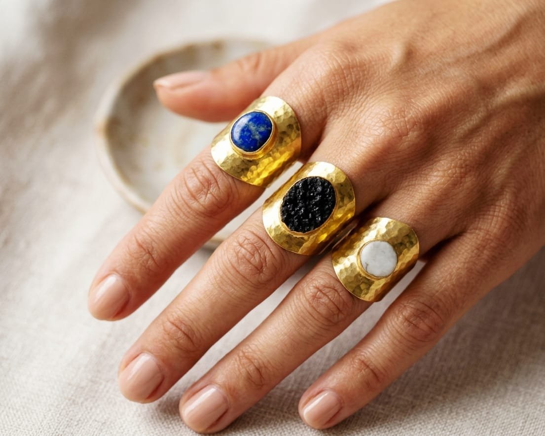 Gli anelli fascioni regolabili, realizzati in pregiato ottone battuto, offrono un design unico e raffinato che cattura l’attenzione. La pietra centrale, disponibile in diverse tonalità, aggiunge un tocco di colore e personalità, permettendoti di esprimere il tuo stile con versatilità. Questi anelli sono perfetti per chi cerca un accessorio che unisca eleganza e praticità, grazie alla regolabilità che assicura un comfort ottimale adattandosi a qualsiasi misura. Che tu voglia impreziosire un look casual o aggiungere un elemento di classe a un outfit più elegante, gli anelli fascioni regolabili in ottone battuto sono la scelta ideale. Lasciati sedurre dalla bellezza artigianale di questi gioielli esclusivi e rendi ogni tuo gesto indimenticabile.