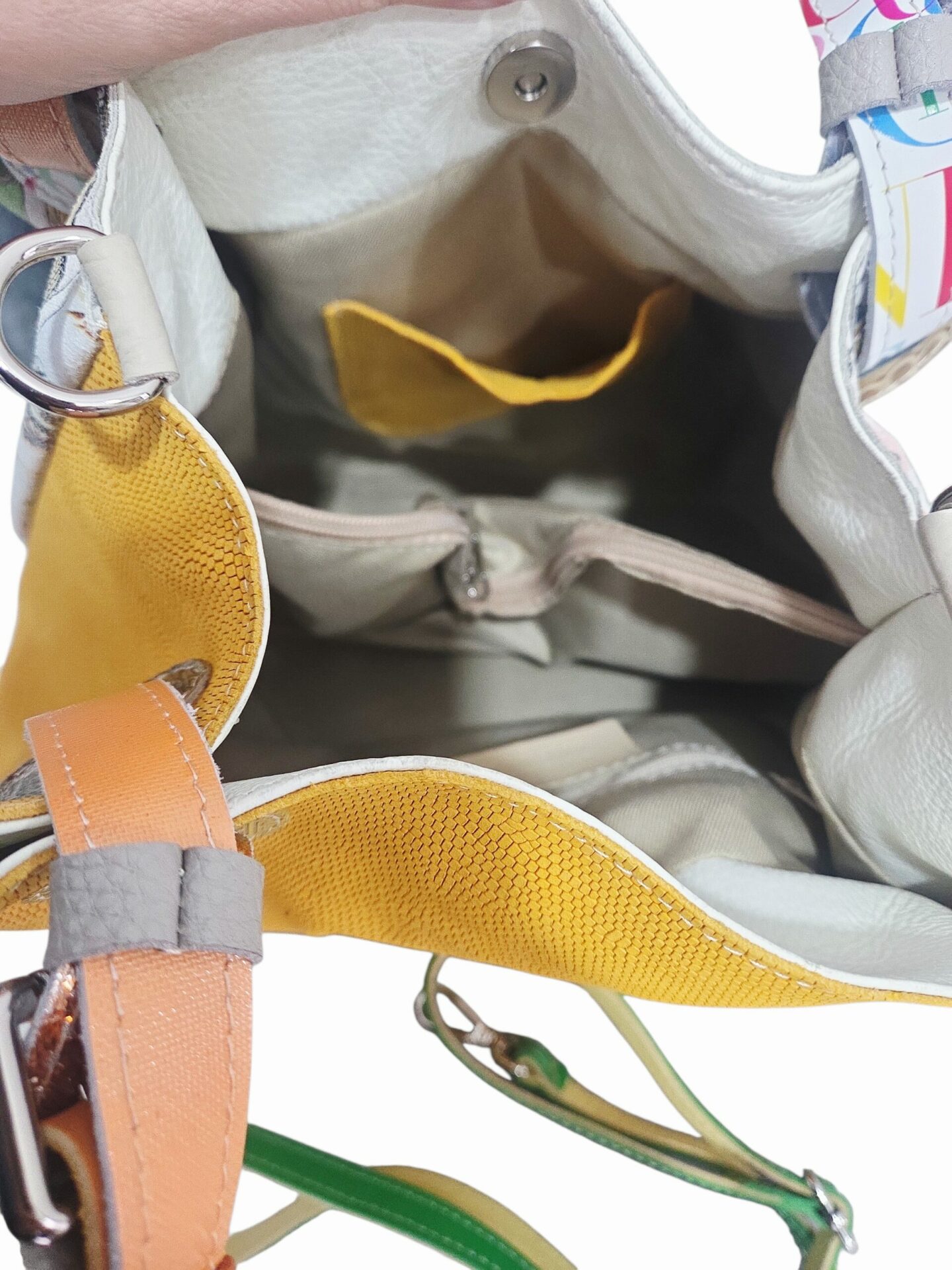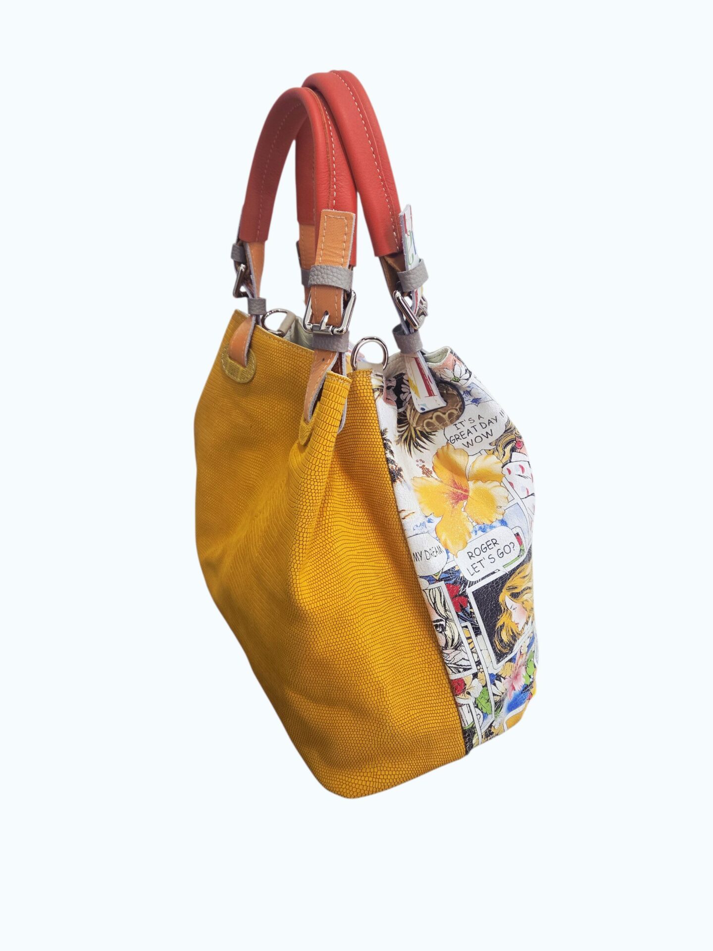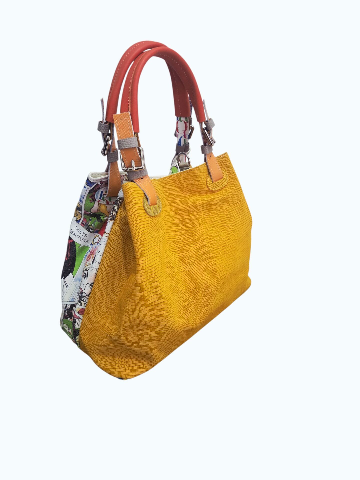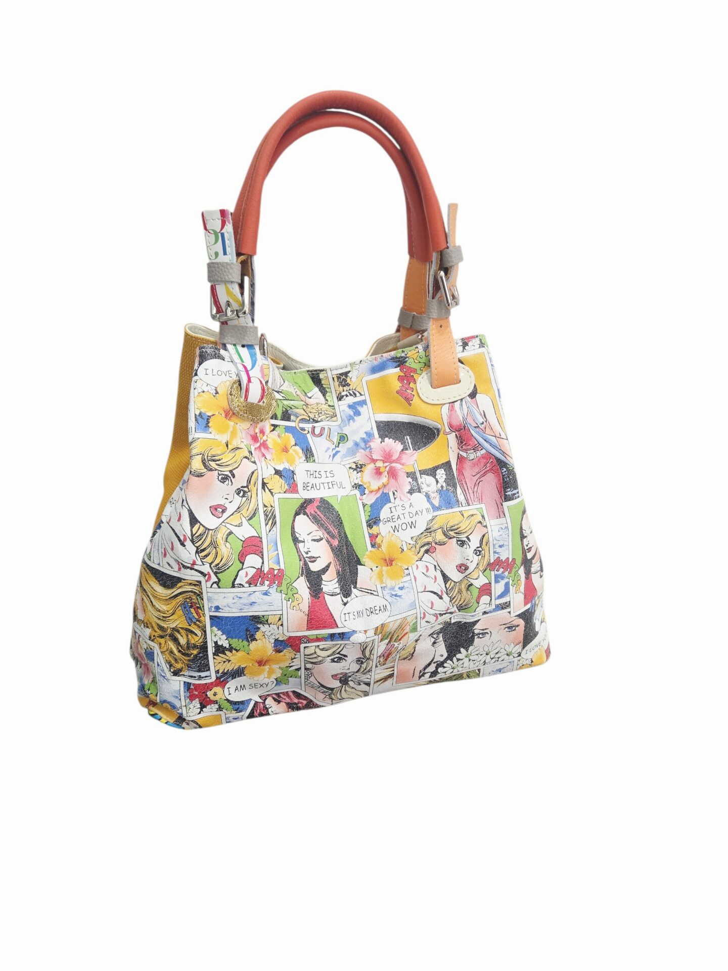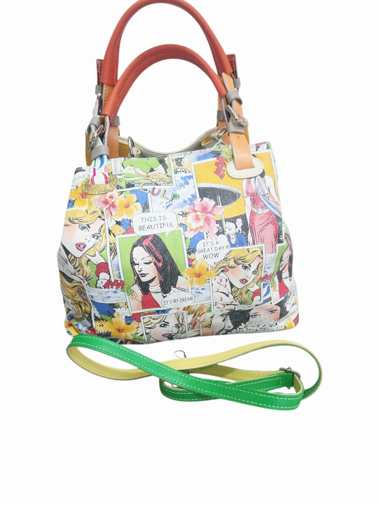 La nostra borsa in vera pelle con fumetti è un accessorio unico che non passerà inosservato. Realizzata con cura in Italia, questa borsa multicolore è dotata di una pratica tracolla regolabile, ideale per il massimo comfort. All’interno, troverai un ampio spazio foderato e ben organizzato con tre scomparti, di cui uno centrale con zip, perfetto per custodire i tuoi oggetti personali in sicurezza. Le tasche laterali aggiungono ulteriore praticità, permettendoti di separare e accedere facilmente ai tuoi effetti personali. La chiusura con bottone magnetico garantisce un accesso rapido e sicuro. Le dimensioni di 28 cm di altezza, 18 cm di base e 33 cm di lunghezza offrono una capacità ideale per le tue esigenze quotidiane, senza sacrificare lo stile. Sia che tu stia andando al lavoro o uscendo per un caffè, questa borsa in pelle con fumetti sarà il tuo compagno di stile perfetto.