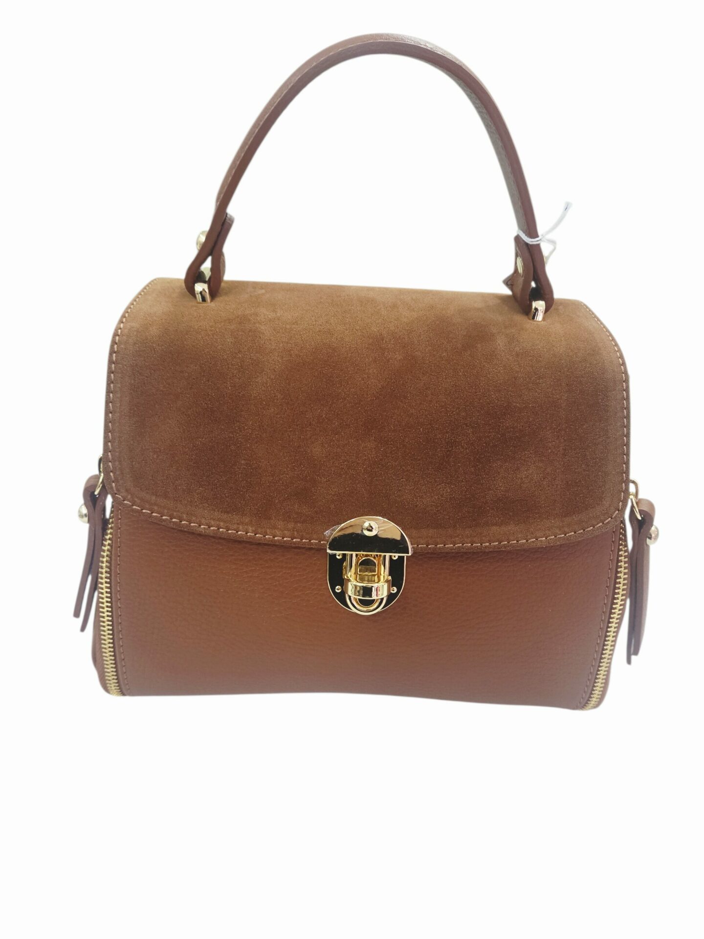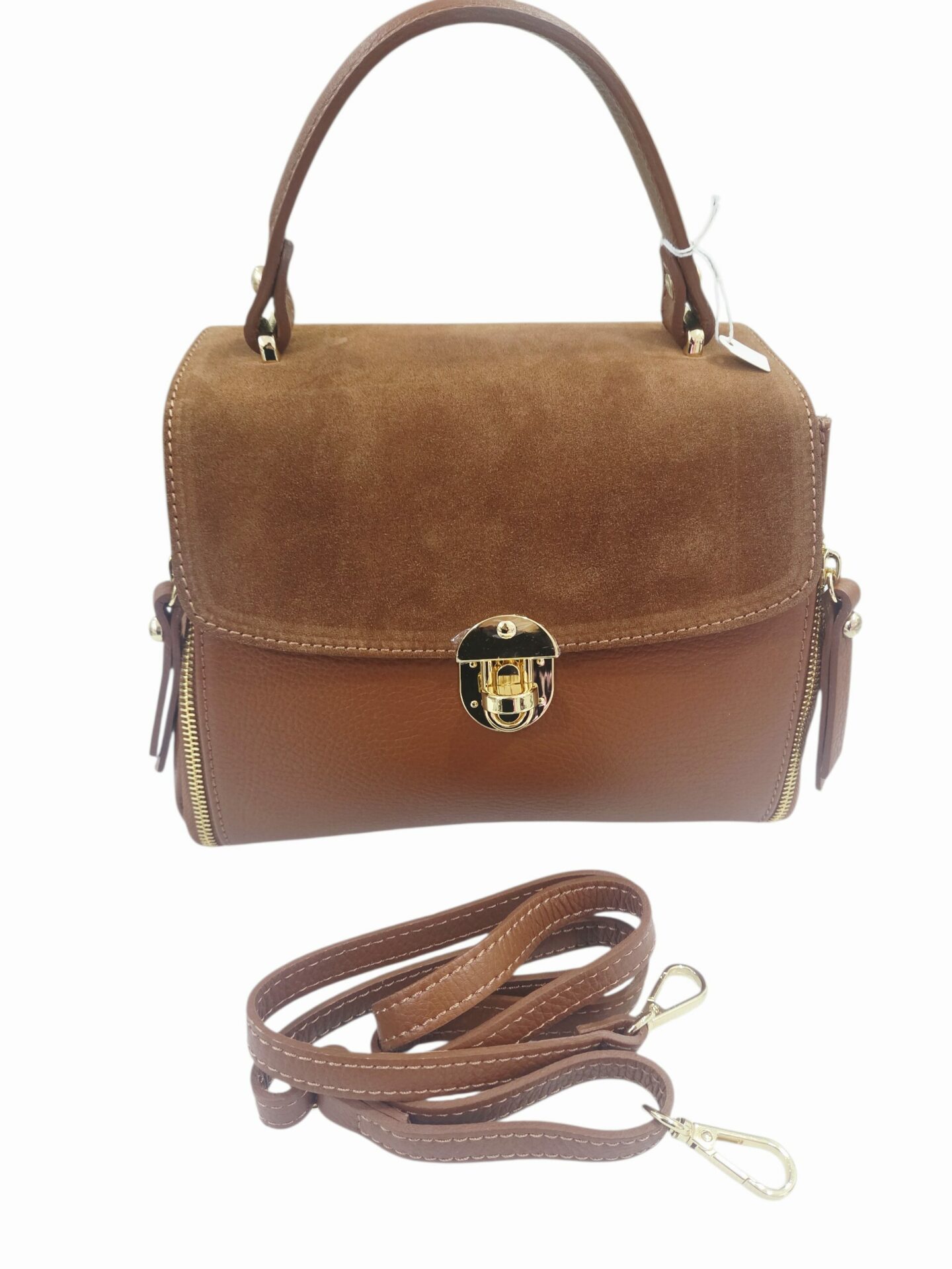 Questa borsa in vera pelle e camoscio color cuoio combina stile e funzionalità in un design unico e raffinato. Realizzata interamente in Italia, la borsa è dotata di una pratica tracolla che offre comfort e versatilità. All’interno, è foderata con cura e dispone di tre scomparti, di cui uno centrale con zip, per tenere tutti i tuoi oggetti in ordine. Una tasca interna laterale con zip aggiunge ulteriore sicurezza per i piccoli accessori. Con dimensioni compatte di 26 cm di lunghezza, 10 cm di larghezza e 20 cm di altezza, questa borsa è ideale per accompagnarti nelle tue giornate di lavoro o per un’uscita serale. Scegli la qualità e l’eleganza del Made in Italy per il tuo guardaroba.