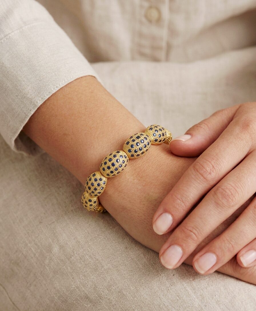 Il nostro bracciale ad incastro rappresenta un perfetto connubio tra artigianalità e design raffinato. Realizzato con maestria, questo gioiello in ottone battuto è arricchito da quattro ovali centrali che ospitano incantevoli zirconi blu. Ogni dettaglio è curato per offrire un accessorio che non solo completa il tuo look, ma racconta anche una storia di passione e tradizione artigianale. La brillantezza degli zirconi si sposa magnificamente con la finitura calda e dorata dell’ottone, creando un contrasto che esalta la bellezza di entrambi i materiali. Perfetto per ogni occasione, questo bracciale è un pezzo unico che aggiunge un tocco di eleganza a qualsiasi outfit, sia esso casual o formale. Indossalo e lascia che il suo stile senza tempo parli per te, trasformando ogni momento in un’occasione speciale.