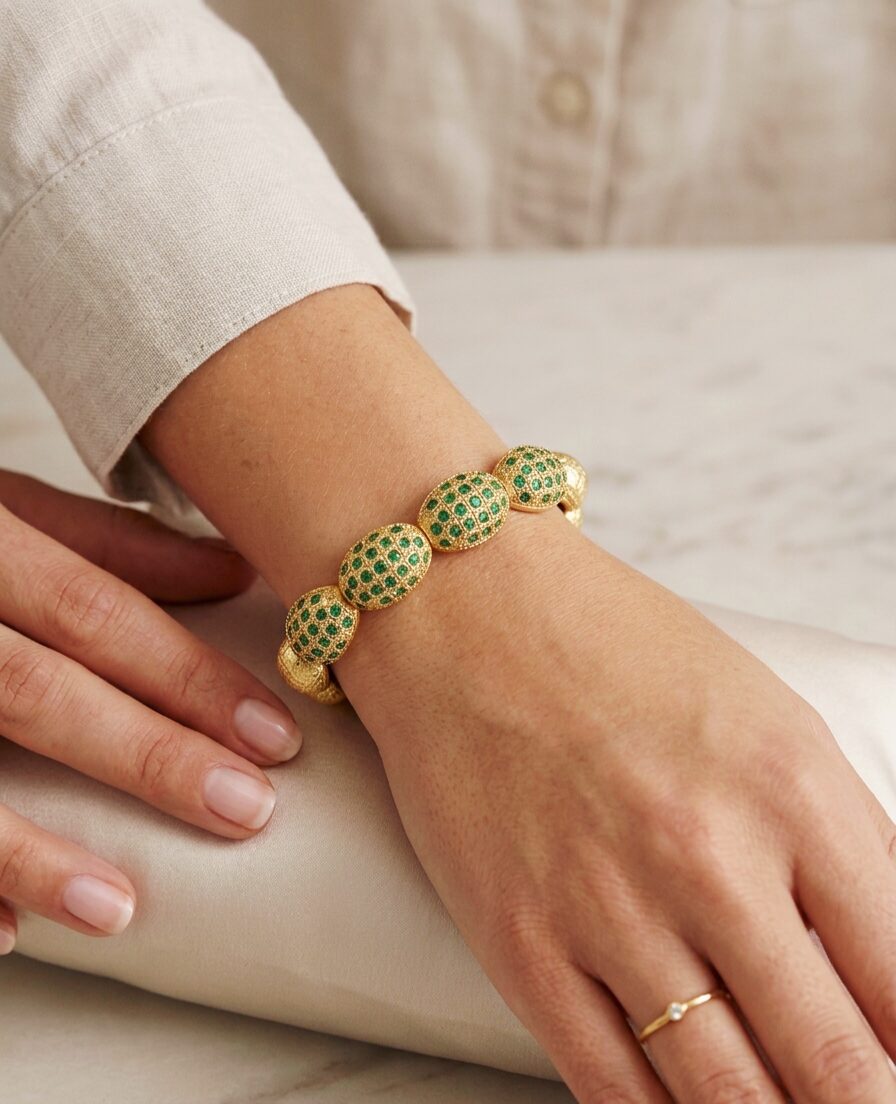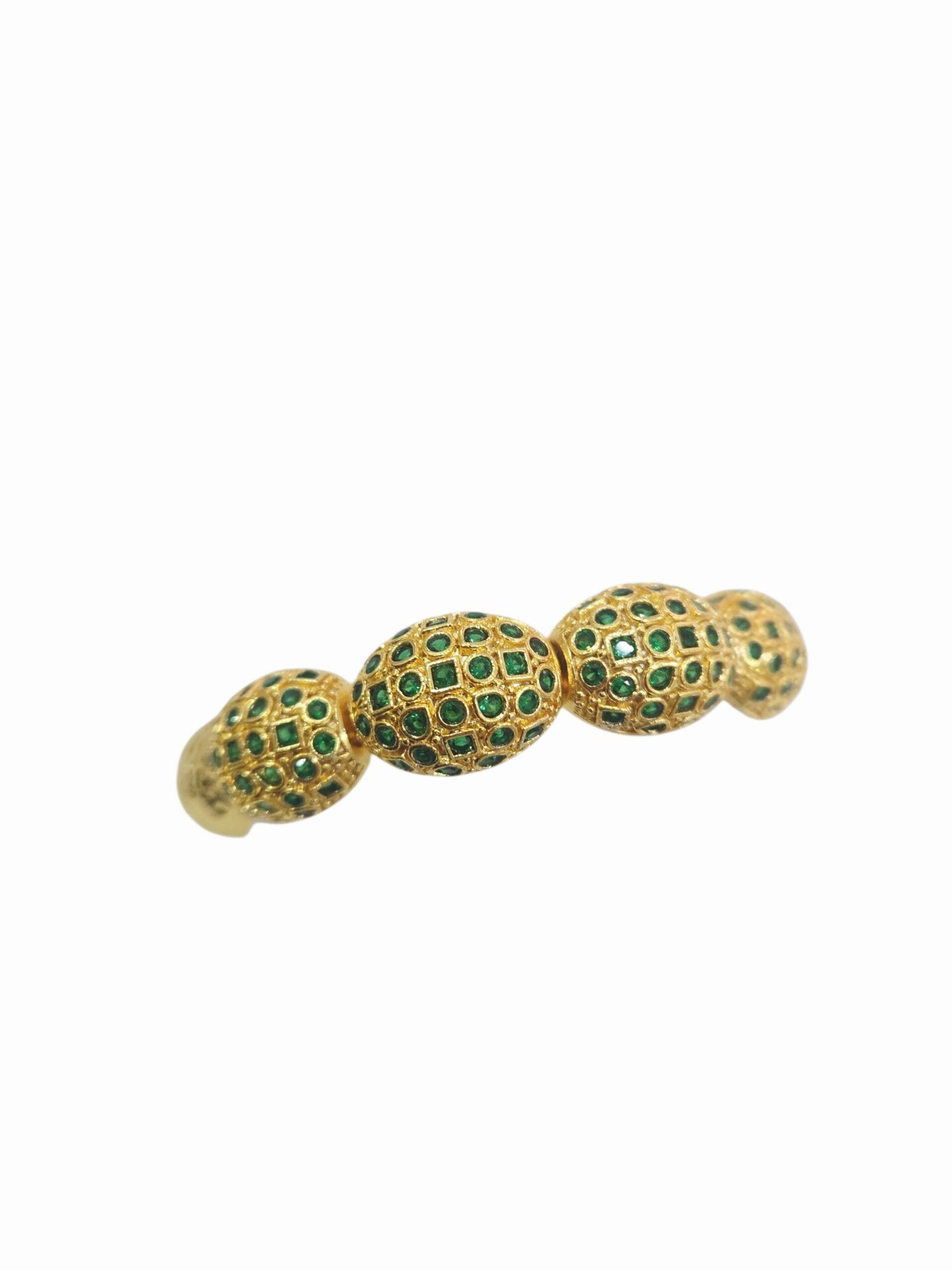 Il nostro bracciale ad incastro è un capolavoro di artigianato, realizzato con cura e passione. Costruito in ottone battuto, questo accessorio unico presenta quattro ovali centrali impreziositi da incantevoli zirconi verdi. Ogni elemento è sapientemente lavorato a mano per garantire un design esclusivo e raffinato. Perfetto per chi desidera aggiungere un tocco di eleganza a qualsiasi outfit, il bracciale è pensato per risaltare su ogni polso, grazie alla sua struttura regolabile e al suo stile senza tempo. Indossalo per un’occasione speciale o per illuminare la tua giornata con un dettaglio prezioso e distintivo. La combinazione di materiali di alta qualità e design artigianale rende questo bracciale non solo un accessorio di moda, ma anche un simbolo di stile e personalità. Lasciati conquistare dalla sua bellezza senza pari e rendi il tuo look ancora più affascinante.