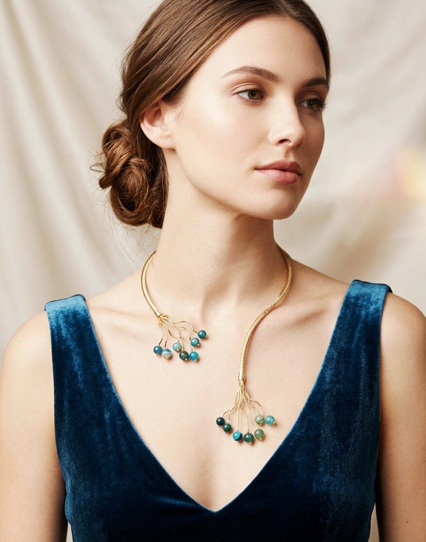 Questa collana girocollo artigianale è un capolavoro di eleganza e stile. Realizzata con cura da mani esperte, combina l’ottone, un metallo noto per la sua resistenza e bellezza, con l’affascinante agata blu striata, che regala al gioiello un aspetto unico. La collana è perfetta per aggiungere un tocco di raffinatezza a qualsiasi outfit, sia esso casual o formale. La scelta dell’agata blu non è casuale: questo minerale è conosciuto per le sue proprietà calmanti e il suo potere di infondere fiducia. Indossare questa collana significa portare con sé un pezzo di arte e cultura, un accessorio che racconta una storia di tradizione e bellezza naturale. Ideale come regalo speciale o come aggiunta alla tua collezione di gioielli, questo girocollo si distingue per la sua luminosità e il suo design senza tempo.