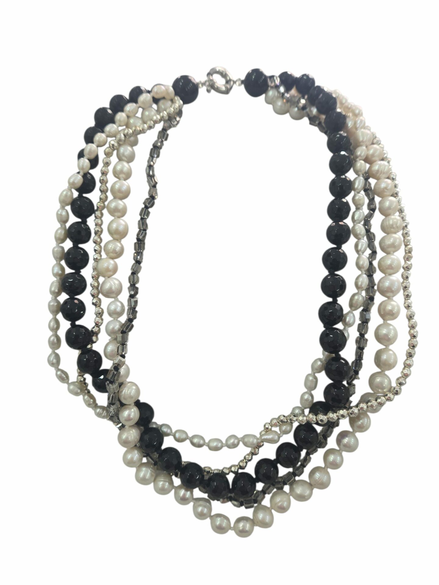 La nostra collana girocollo รจ un gioiello unico che unisce eleganza e raffinatezza in un design mozzafiato. Realizzata con una combinazione di perle di fiume, onice, ematite e scintillanti cristalli cubici, questa collana di 53 cm รจ perfetta per aggiungere un tocco di classe a qualsiasi outfit. Le perle di fiume conferiscono un fascino naturale e classico, mentre l’onice e l’ematite apportano un tocco di modernitร e mistero. I cristalli cubici, infine, donano una luminositร che cattura la luce in modo incantevole. Ideale per occasioni speciali o semplicemente per sentirsi speciali ogni giorno, questa collana รจ un must-have per chi ama distinguersi con stile. La chiusura sicura e il design confortevole assicurano che possa essere indossata con facilitร e piacere.