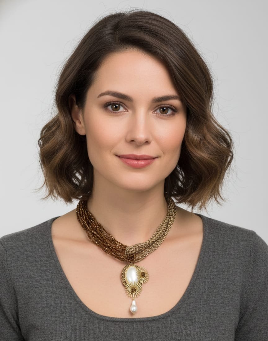 Lasciati conquistare dalla sofisticata bellezza della nostra collana girocollo, un accessorio che unisce stile e raffinatezza. Realizzata con tessuto di alta qualitร e zirconi marroni intagliati, questa collana รจ pensata per chi ama distinguersi con eleganza. Il ciondolo centrale, arricchito da elementi dorati e una perla scaramazza, aggiunge un tocco di lusso e originalitร al tuo look. Con una lunghezza regolabile fino a 45 cm, si adatta perfettamente al tuo dรฉcolletรฉ, rendendola l’accessorio ideale per ogni occasione, sia formale che casual. Abbina questa collana con il tuo outfit preferito e preparati a ricevere complimenti per il tuo stile inconfondibile. Non perdere l’opportunitร di aggiungere un pezzo unico al tuo portagioie.