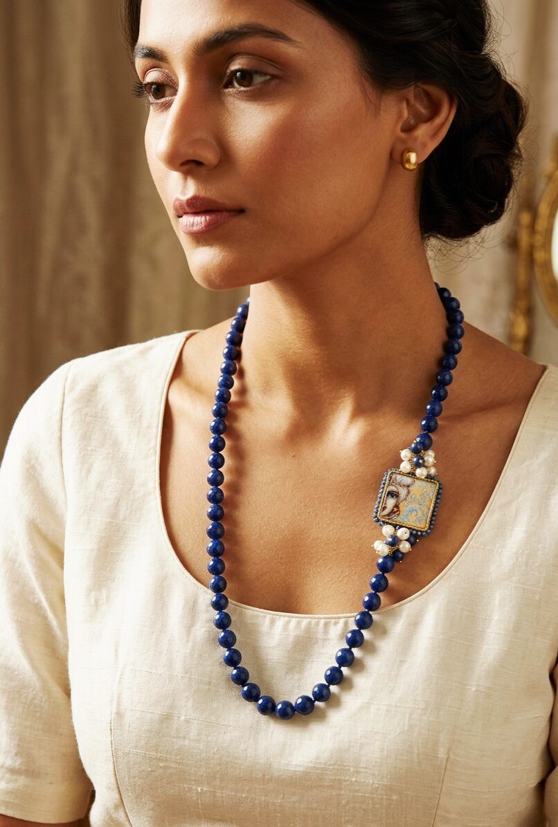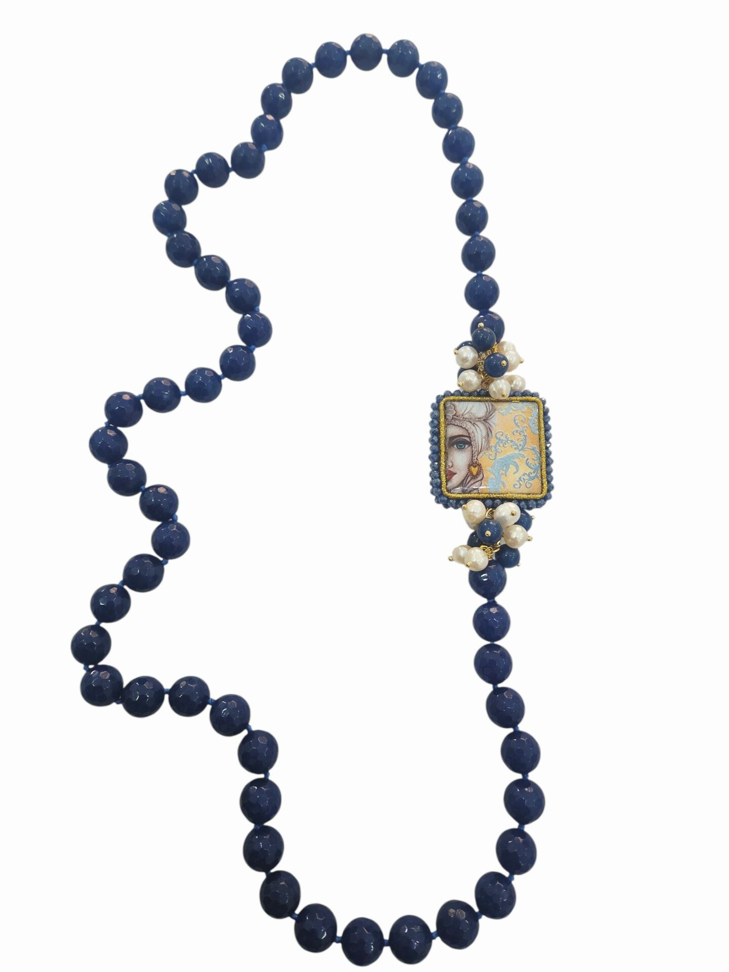 Questa collana lunga è un gioiello che unisce eleganza e tradizione, perfetta per chi ama distinguersi con classe. Realizzata con agata blu e perle di fiume, questa collana è arricchita da dettagli unici in ceramica di Caltagirone, che raffigurano teste di moro, simbolo iconico della cultura siciliana. Le teste di moro, doppie in pietra lavica, rappresentano un uomo e una donna e sono abilmente contornate da quarzi, aggiungendo un tocco di raffinatezza e mistero. La lunghezza di 76 cm rende questa collana un accessorio versatile, ideale sia per un look elegante da sera che per dare un tocco distintivo al tuo outfit quotidiano. Indossare questa collana significa portare con sé un pezzo di storia e arte, un gioiello che racconta storie antiche e che saprà valorizzare ogni tua occasione speciale.
