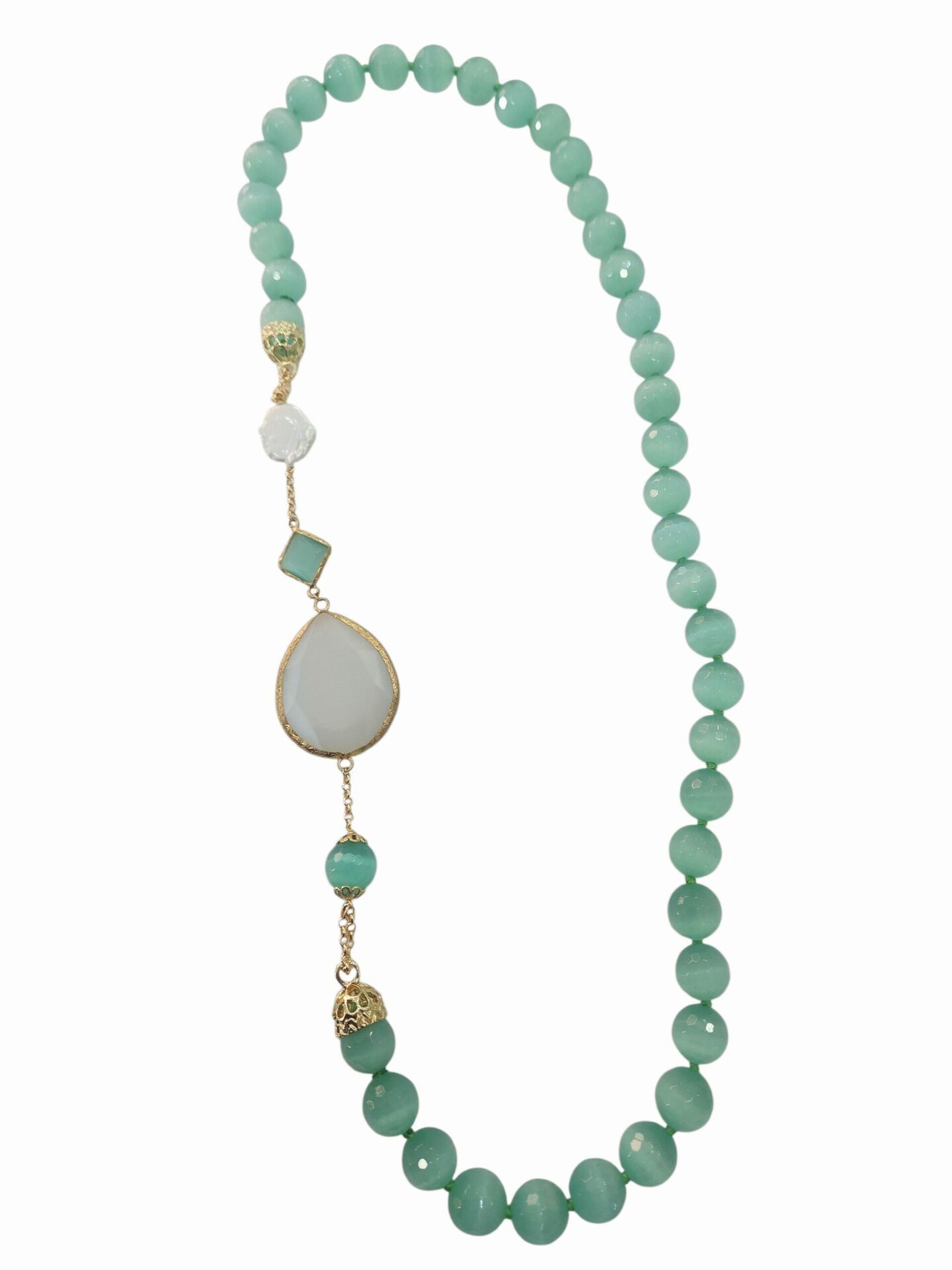 La nostra Collana Lunga con Occhio di Gatto Verde Acqua è una celebrazione di stile e raffinatezza. Questa collana unica è realizzata con pietre di occhio di gatto verde acqua, note per il loro colore affascinante e la loro capacità di catturare la luce in modi sorprendenti. Il design è ulteriormente impreziosito da una perla barocca posizionata lateralmente, che aggiunge un tocco di eleganza senza tempo. Un elemento distintivo della collana è l’occhio di gatto neutro, sapientemente circondato da dettagli in ottone, che crea un contrasto armonioso con le tonalità verdi. Con una lunghezza di 76 cm, questa collana è perfetta per essere indossata da sola o abbinata ad altri gioielli per un look stratificato. Ideale per chi ama accessori che raccontano una storia, questa collana è un’aggiunta perfetta a qualsiasi guardaroba.