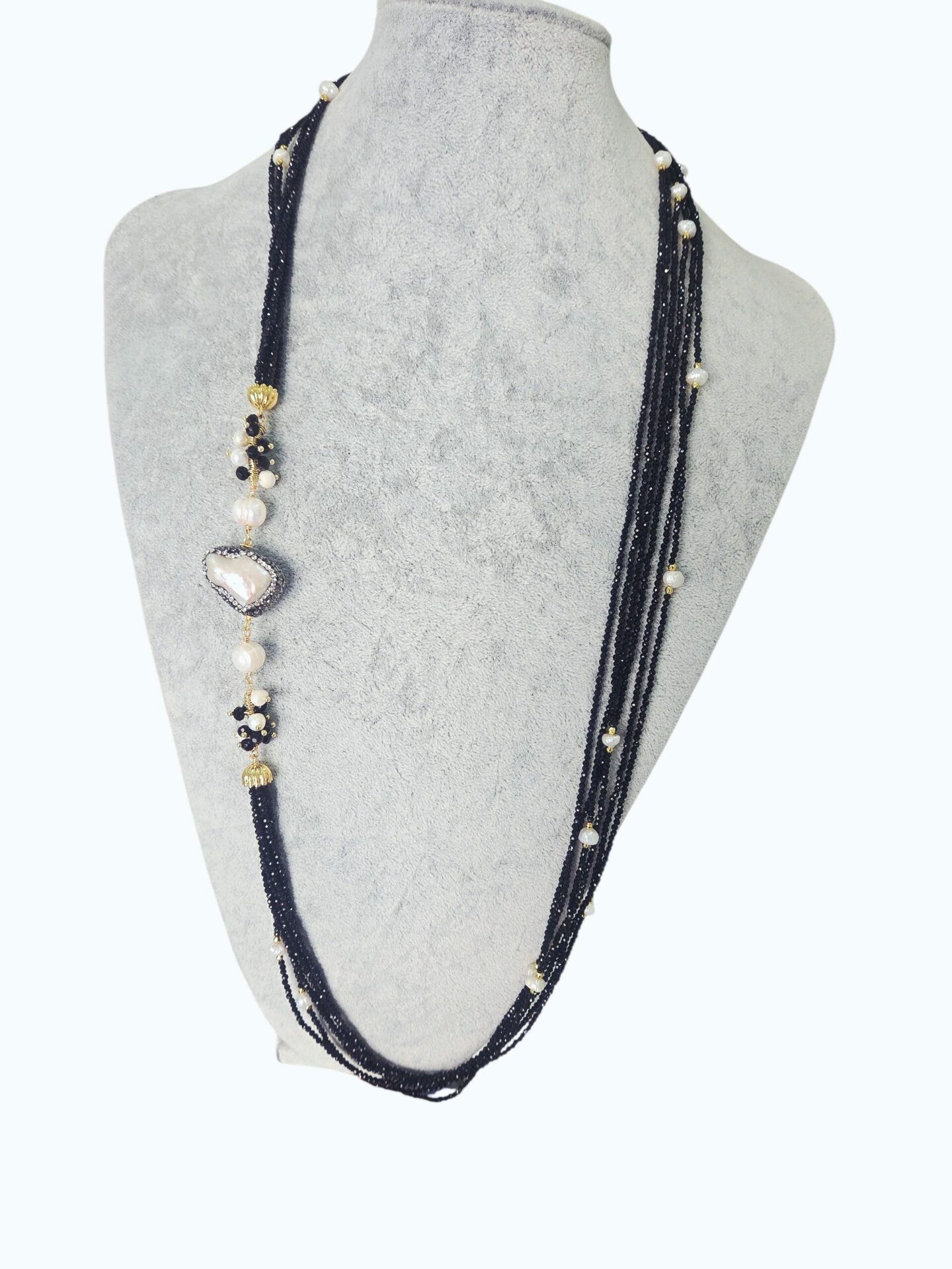 Lasciati conquistare dalla raffinatezza della nostra collana lunga, un gioiello che combina l’eleganza del quarzo nero, il fascino delle perle di fiume e la ricercatezza di una perla di Marocco con marcasite. Con una lunghezza di 90 cm, questa collana avvolge delicatamente il collo, aggiungendo un tocco di classe a qualsiasi outfit. I quarzi neri conferiscono un’aura di mistero, mentre le perle di fiume aggiungono una nota di freschezza e luminosità. La perla di Marocco, impreziosita da dettagli in marcasite, dona un accento esotico e sofisticato. Ideale per chi ama distinguersi con accessori unici e di qualità, questa collana è perfetta per serate eleganti o per arricchire il tuo look quotidiano. Regalati o regala un gioiello che esprime personalità e stile senza tempo.