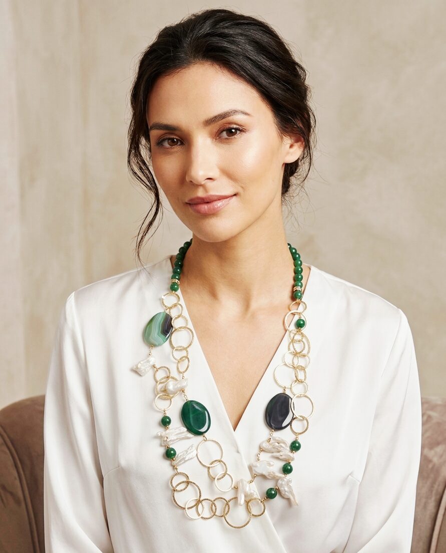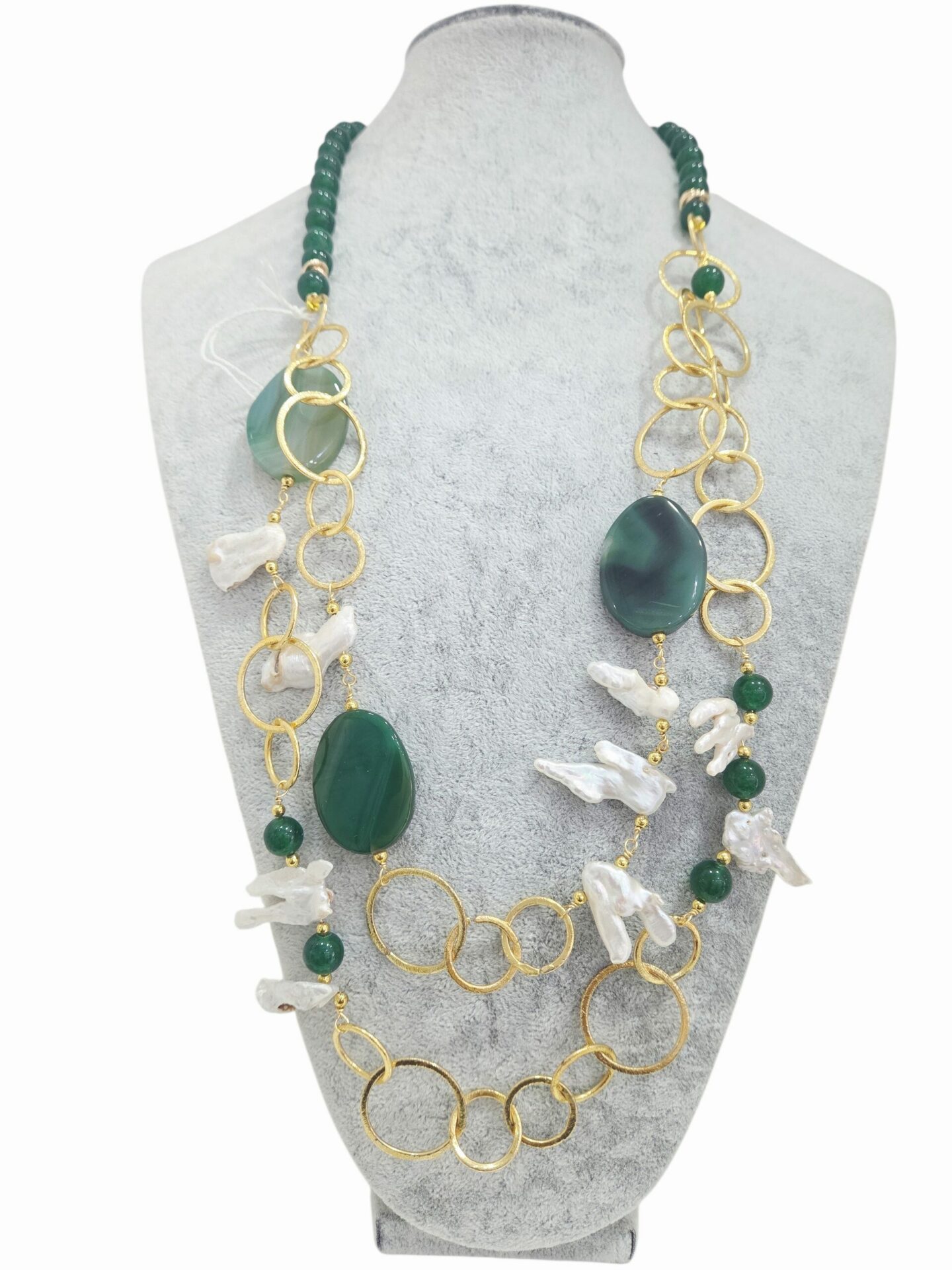 Lasciati incantare dalla bellezza naturale della nostra collana, un capolavoro artigianale che unisce materiali pregiati e design sofisticato. La giada verde, simbolo di serenità e armonia, si fonde con l’agata, nota per le sue proprietà protettive, creando una sinergia perfetta. Le perle barocche irregolari, con la loro unicità, aggiungono un tocco di originalità e raffinatezza. La catena in ottone anallergica garantisce comfort e sicurezza, adattandosi a ogni tipo di pelle. Con una lunghezza di 74 cm, questa collana è l’accessorio ideale per impreziosire qualsiasi outfit, dal più casual al più elegante. Indossala per esprimere il tuo stile unico e sofisticato, o regalala a una persona speciale per un dono indimenticabile.