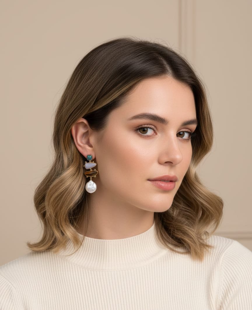 Gli orecchini in ottone con apatite, calcedonio, occhio di tigre, perla di fiume piatta e zirconi offrono un mix affascinante di colori e texture. Con una lunghezza di 4.5 cm e un peso di soli 5.7 grammi, questi orecchini sono leggeri e comodi da indossare tutto il giorno. Ogni pietra รจ selezionata per esaltare la tua bellezza naturale, mentre la base in ottone aggiunge un tocco di eleganza senza tempo. Perfetti per un look casual o per una serata speciale, questi orecchini sono l’accessorio ideale per chi ama distinguersi con stile. Aggiungi un tocco di glamour e raffinatezza al tuo guardaroba con questo gioiello unico nel suo genere.