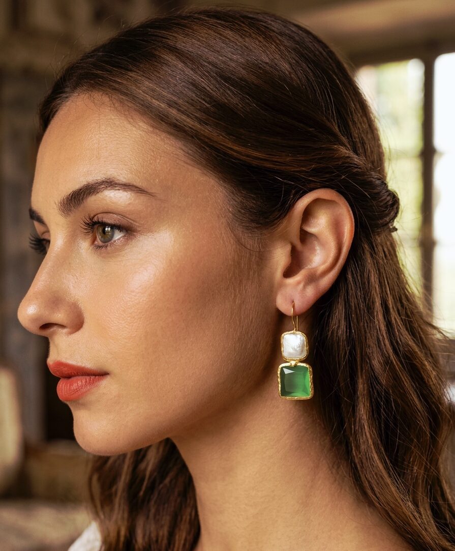 Esalta il tuo stile con questi orecchini artigianali che combinano eleganza e unicità. Ogni pezzo è impreziosito da perle di fiume piatte, rinomate per la loro bellezza naturale, e da pietre occhio di gatto verde, che aggiungono un tocco di mistero e raffinatezza. Il tutto è armoniosamente avvolto in ottone, creando un contrasto caldo e attraente. Con una lunghezza di 4.5 cm e un peso di soli 4 grammi, questi orecchini sono leggeri e comodi da indossare per tutto il giorno, perfetti per ogni occasione, dal lavoro a una serata speciale. Aggiungi un tocco di eleganza al tuo look e lasciati conquistare dalla loro bellezza senza tempo.