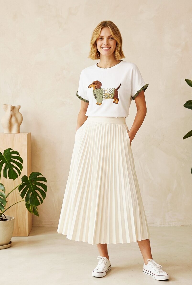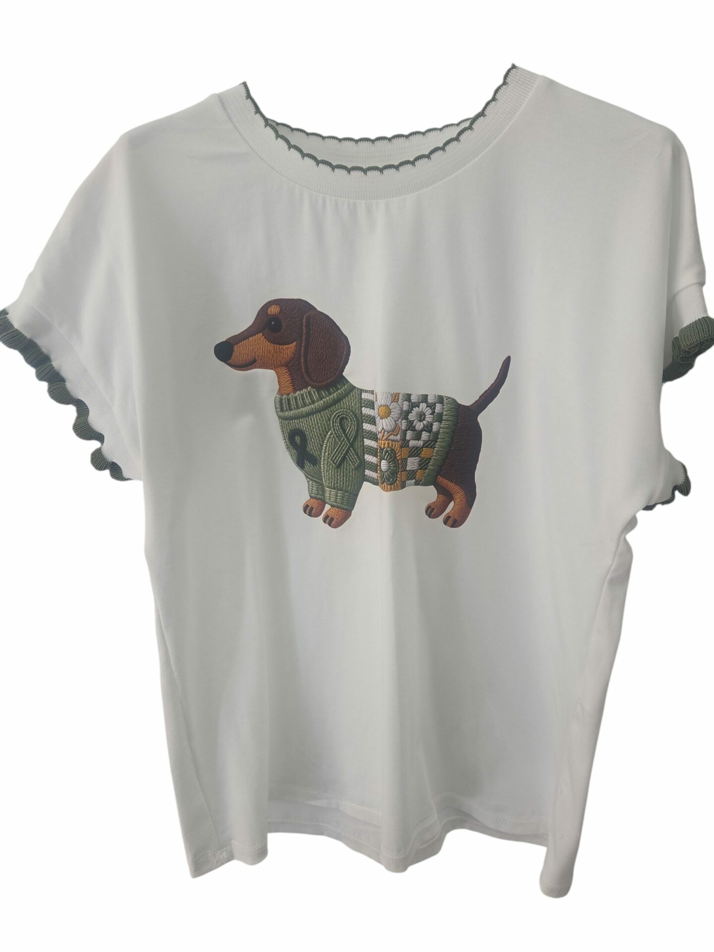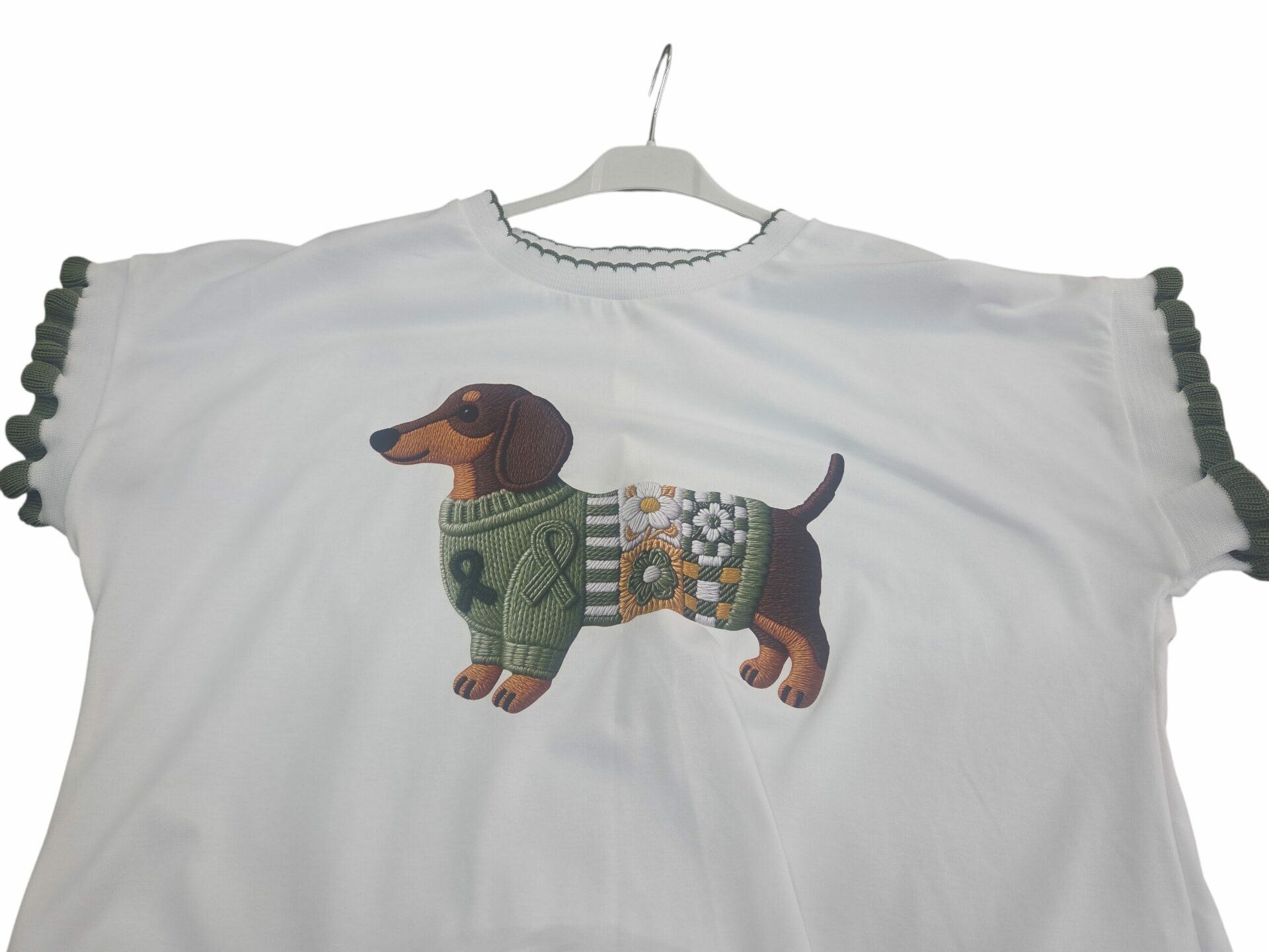La t-shirt a manica corta con bassotto stampato è la scelta perfetta per chi desidera un look casual ma ricercato. Realizzata in morbido cotone al 100% con un tocco di elastame al 5%, questa maglietta offre il massimo comfort e una vestibilità perfetta. Il design unico con maniche arricciate aggiunge un tocco di originalità, mentre il girocollo classico assicura un look sempre alla moda. Il verde vibrante e la simpatica stampa del bassotto rendono questa t-shirt un capo versatile da abbinare a jeans, gonne o pantaloni casual. Perfetta per ogni occasione, che si tratti di una passeggiata pomeridiana o di un ritrovo con amici, questa maglietta diventerà presto il tuo capo preferito nell’armadio. Non lasciarti sfuggire l’occasione di esprimere la tua personalità con stile!