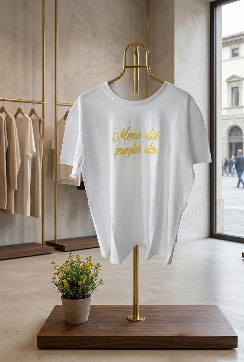 Scopri la nostra t-shirt a manica corta con la scritta ricamata “meno dai meglio stai”. Realizzata in un morbido tessuto composto al 95% da cotone e al 5% da elastame, questa maglietta offre una vestibilità unica e confortevole. Perfetta per ogni occasione, la sua taglia unica e la vestibilità morbida si adattano facilmente a diverse silhouette. Il ricamo aggiunge un tocco di personalità, trasformando un capo essenziale in un’espressione di stile e filosofia di vita. Ideale per chi cerca comfort senza rinunciare a un messaggio originale e positivo. Abbinala facilmente con jeans o pantaloni casual per un look rilassato ma ricercato. Indossa il tuo motto e affronta la giornata con stile!
