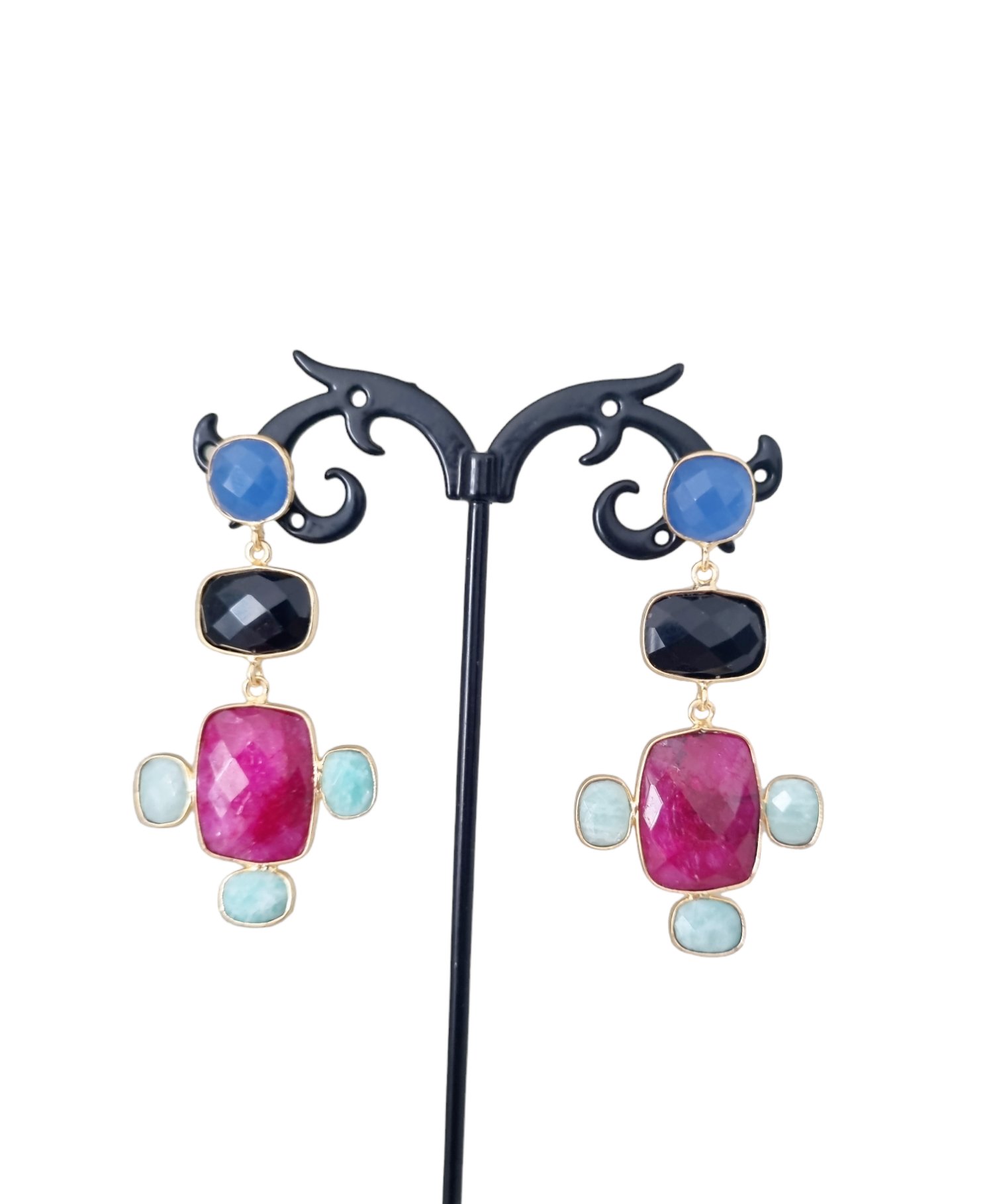 Orecchini realizzati con radice di rubino, onice e quarzi. elementi dorati in ottone. Peso 5.3gr Lunghezza 7.5cm